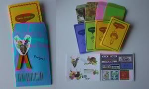 This is a set of four mini birthday cards and handmade envelopes. You also get a set of stickers, one sheet of cute bunnies,birds or deer and one sheet of vintage airmail postal stickers. This is set A which means the cards, envelopes, and stickers pictured are exactly what's in the mini package.
